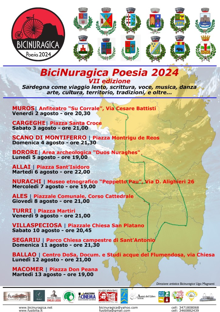 Venerdì 2 agosto 2024 si inaugura a Muros, nella Sardegna nord-occidentale, la VII edizione dell’evento ciclopoetico “BiciNuragica Poesia”, Sardegna come viaggio lento, scrittura, voce, musica, danza, arte, cultura, territorio, tradizioni e oltre…, a cura di Ugo Magnanti.