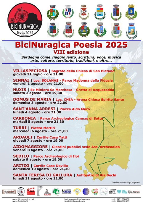 Giovedì 31 luglio 2025 si inaugura a Villaspeciosa, nel Campidano, la VIII edizione dell’evento ciclopoetico “BiciNuragica Poesia”, Sardegna come viaggio lento, scrittura, voce, musica, arte, cultura, territorio, tradizioni e oltre…, a cura di Ugo Magnanti.